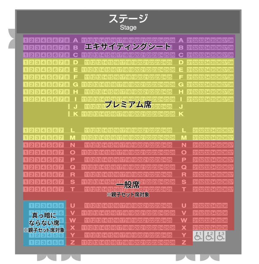 공연 중에도 밝기가 유지되는 좌석입니다. 처음 어린이와 어두움이 신경이 쓰이는 고객은 꼭 이쪽을 이용하십시오. 좌석은 U열~Z열・1번~6번 (좌석도는 이쪽) 입니다.