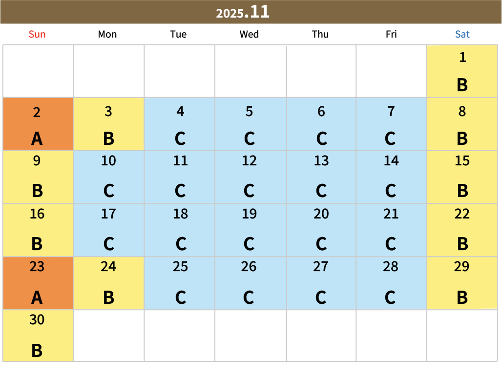 아래의 캘린더로 입장일의 A・B・C・D를 체크하신 후, 캘린더 아래의 요금표에서 확인해 주십시오.