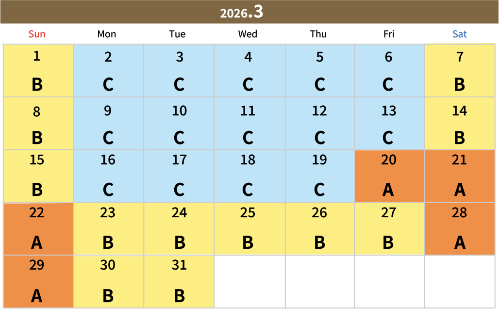 아래의 캘린더로 입장일의 A・B・C・D를 체크하신 후, 캘린더 아래의 요금표에서 확인해 주십시오.